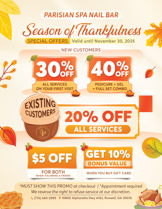 Welcome to Parisian Spa Nail Bar, where relaxation and beauty meet in perfect harmony. Located in the heart of Roswell, we provide a serene escape designed to indulge your senses and rejuvenate your spirit. Our expert team delivers high-quality services, ensuring each visit leaves you feeling pampered and refreshed. With a focus on luxury, comfort, and personalized care, we are committed to offering an unparalleled experience with every treatment.